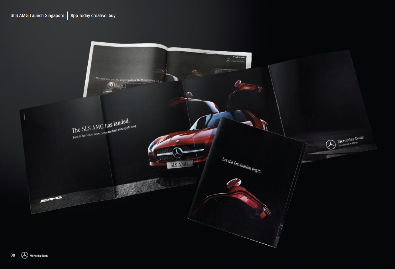 As Creative Director for Mercedes-Benz (South East Asia) at BBDO Singapore, I had the privilege of launching the SLS-AMG to the region – one of the world’s most fascinating super sports cars with its gullwing doors that reach to the heavens. I created billboards, print ads, special newspaper wraps, direct mail invitations, digital banners and more. Due to the car’s popularity in Europe, the Asian launch had to be pushed back and was much anticipated, a situation that lent itself to the newspaper and billboard headline The SLS AMG has landed. I also launched BlueEFFICIENCY, the company’s blueprint for an eco-friendlier future, the stylish E-Class Cabriolet, and produced sustenance campaigns for C-Class and the world-leading S-Class and more.